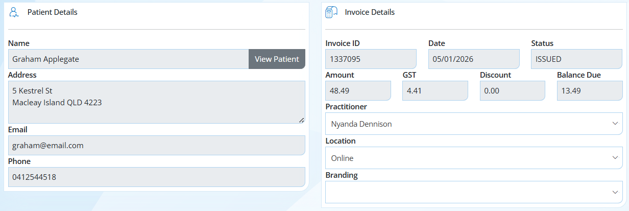 - Patient Details - The details panel is auto populated based on the patient selected when creating the invoice.