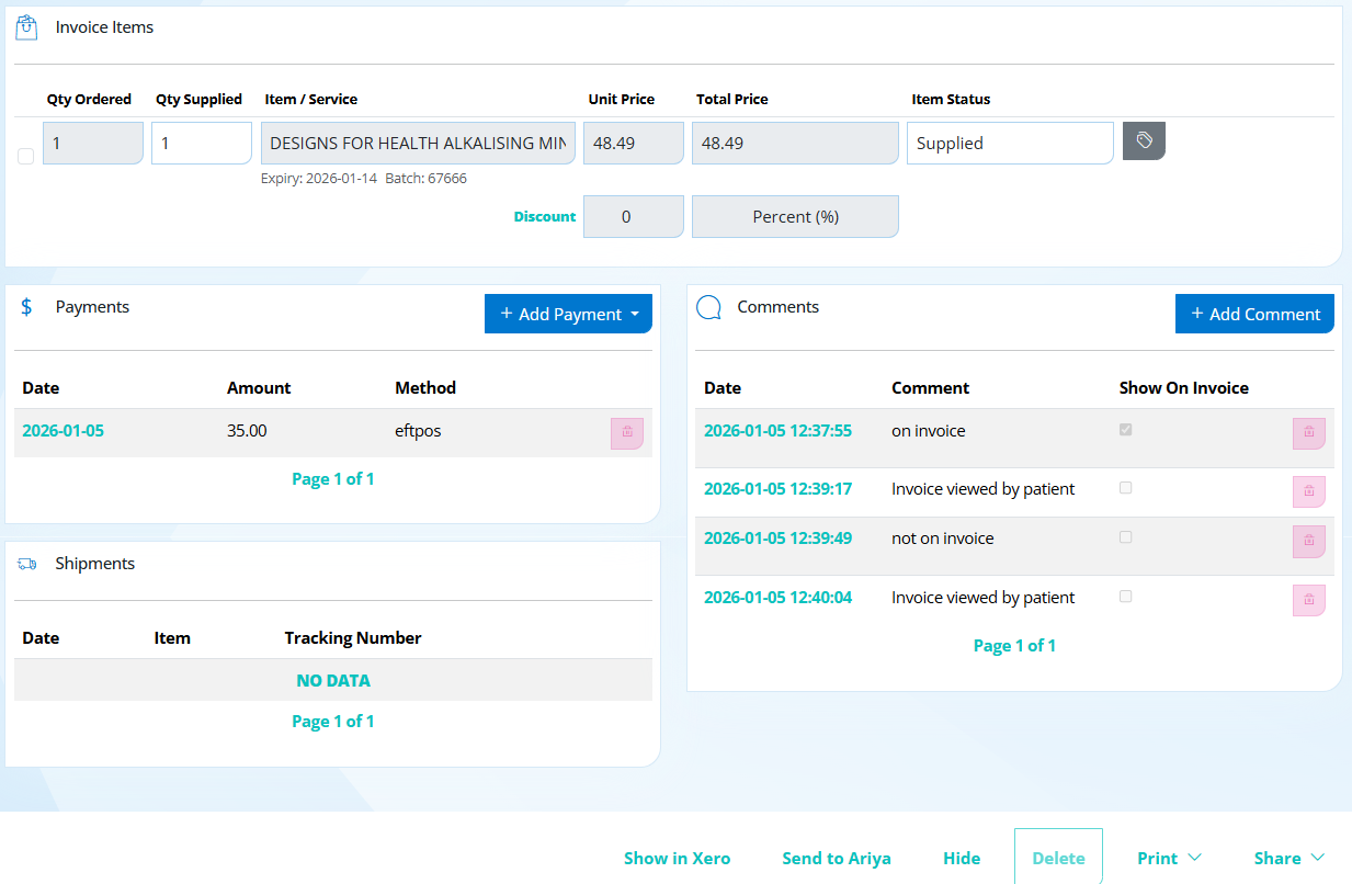 - Action bar (bottom right) – Options here include - Show in Xero, Send to Ariya, Hide, Delete, Print (invoice, receipt or label) and Share (via email or SMS).