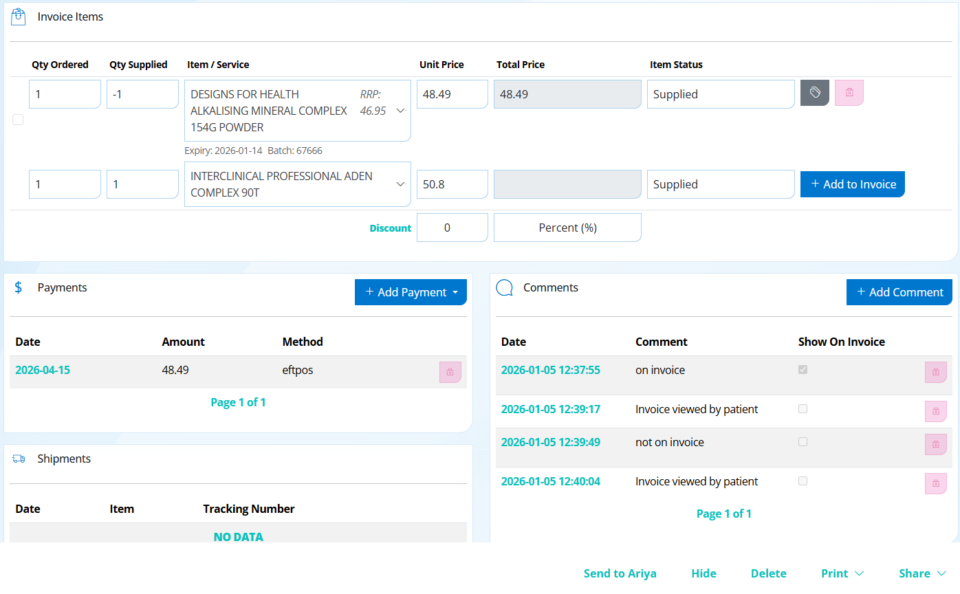 - Comments – The comments panel will allow you to record comment against the invoice. This can be marked as either shown or hidden. Shown comments will print on the invoice while hidden will not display on the invoice and are for internal use only. By default SimpleClinic journals the history of the invoice including items added, item status changes, payments recorded and invoice access (including if you access it yourself).