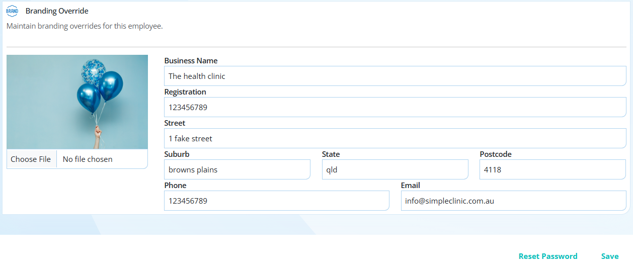 By default, the main clinic details found under Business Setup --> Your Clinic --> Clinic will be used for branding invoices and prescriptions. In some cases, if you have an additional practitioner on your SimpleClinic account, they may want to create a branding override which will be used on their invoices and prescriptions.