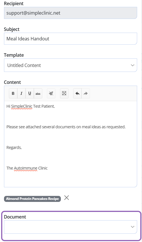 Type in the email details as needed. In the Attachments field, type in at least 3 letters of the document name, and select the document from the list. You can add more than one document to the patient email if required.