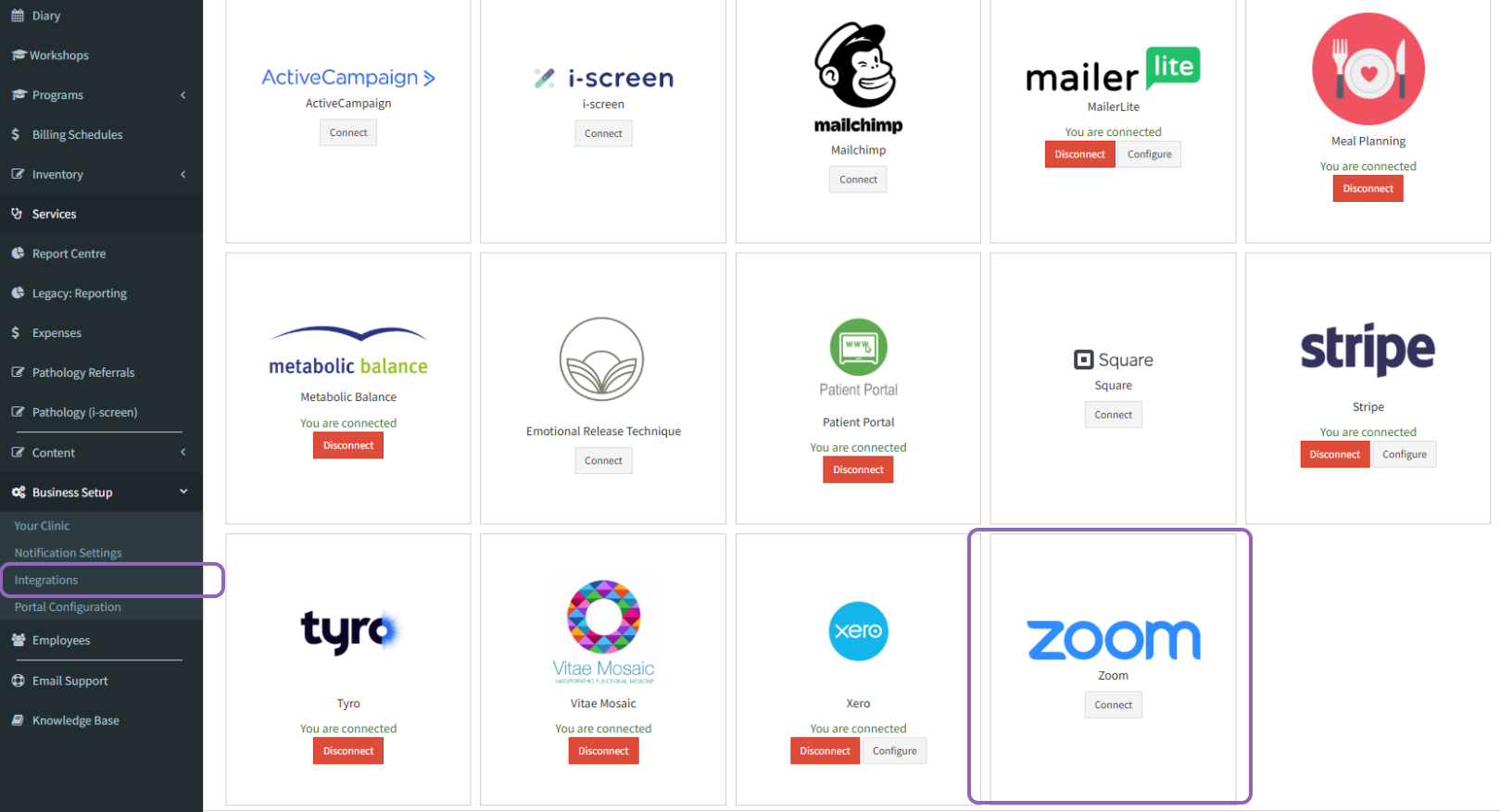 The first step integrating with Zoom is to connect your SimpleClinic business account to your Zoom account. To do this log in to your SimpleClinic account and click the Business Setup option in the left side navigation menu and then choose Integrations.