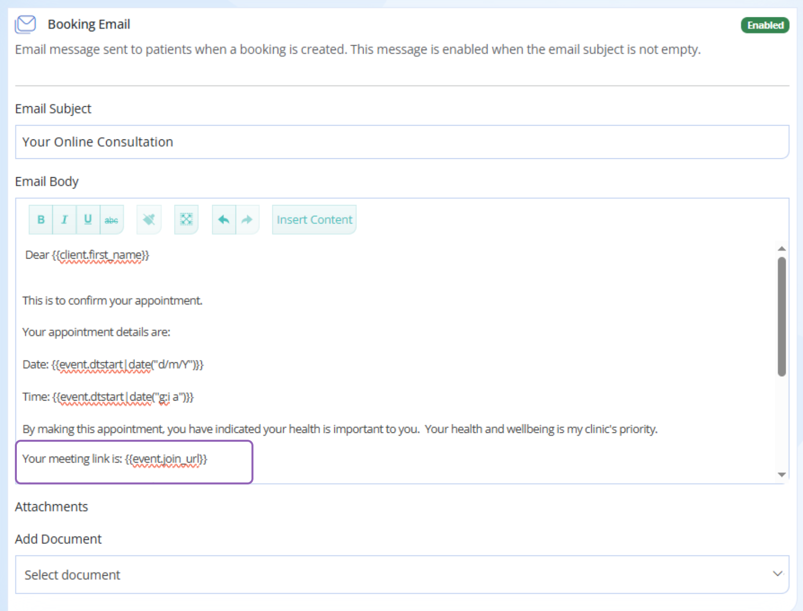 Your meeting link can be included in the booking and reminder messages that are sent to patients by adding it to your messages.