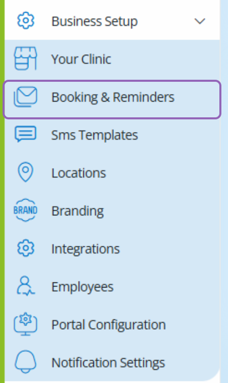 To do this select Business Setup -> Booking & Reminders from the navigation bar on the left hand side.