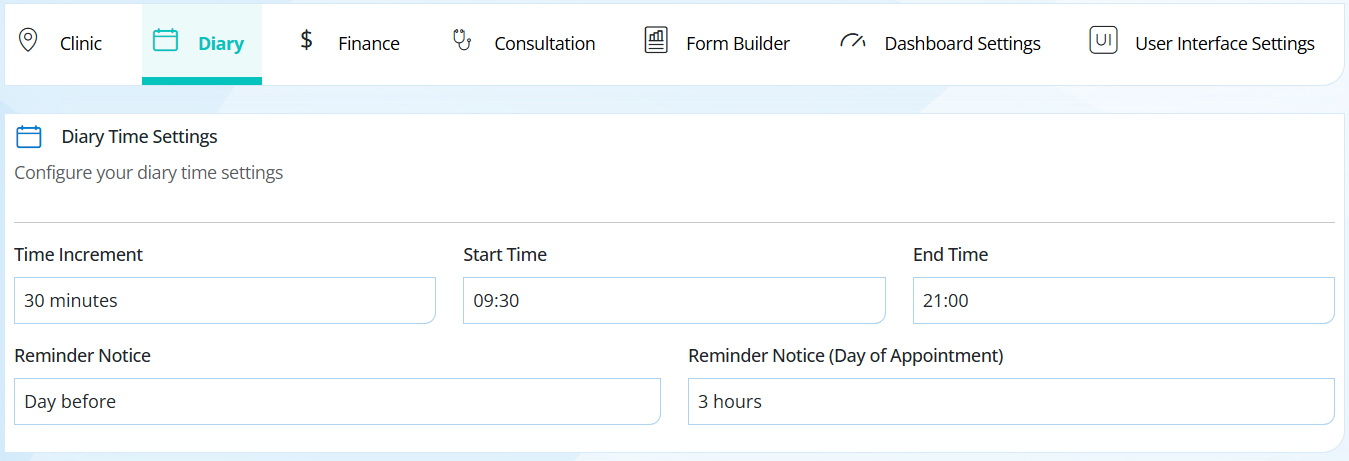 - Reminder emails and SMSs are sent based on selections made in Business Setup -> Your Clinic -> Diary Settings (see notes below and image).