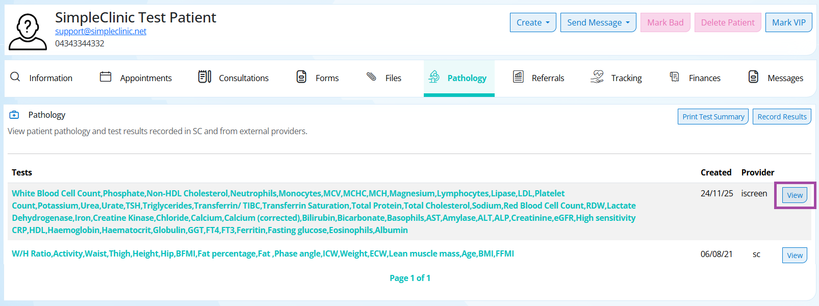 Select Patients from the navigation menu --> select your patient --> from the Patient Record click on the Pathology tab --> select VIEW button next to the results --> select Print if required (as per images below).