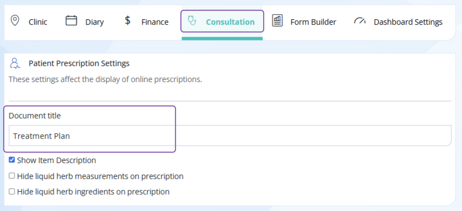 1. Go to Business Setup -> Your Clinic -> Consultation tab -> Patient Prescription Settings -> edit the Document Title -> Save