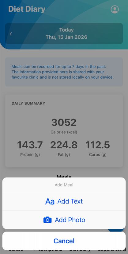 Step 7. Select an option to add meals -> either add text, which can also be voice dictation, or upload a photo and AI will calcuate macro and micro nutrients. Values will be more accurate depending on the level of data entered and how clearly the food can be seen in the photo. Once meals are entered they can be re-selected for easy entry next time as below.