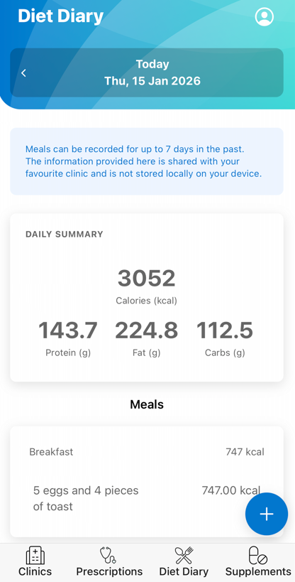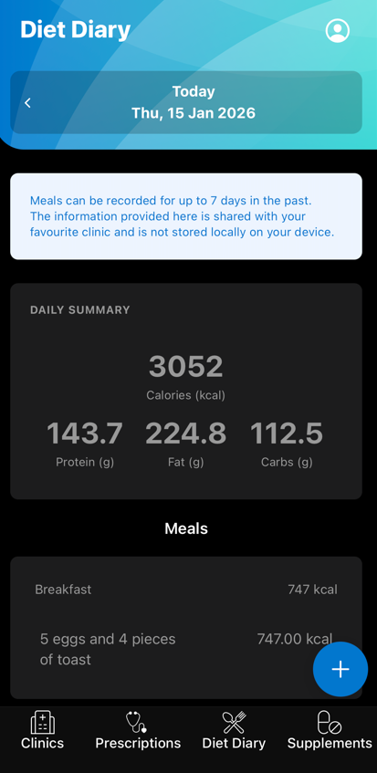 Step 6. Select the plus (+) button to add meals to the diet diary. The view will default to the current date, use the arrows next to the date field to go back up to 7 days.