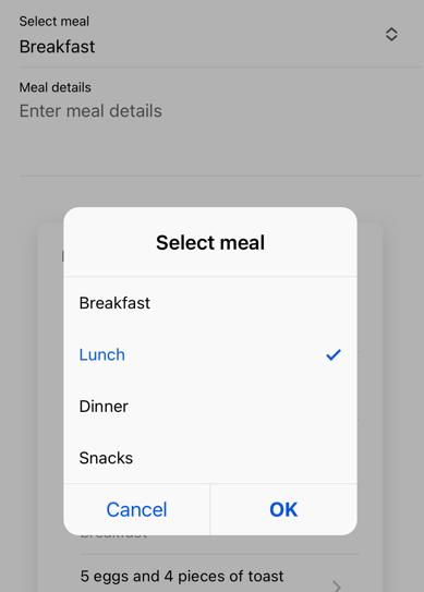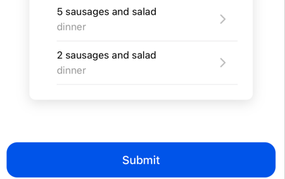Step 8. Select the meal - breakfast, lunch, dinner, snacks - and then enter the meal details or select a recently entered meal. Scroll to the bottom of the screen to select Submit when done.