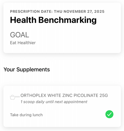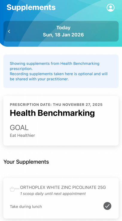 Step 10. Select the tick next to your supplement (from your favourite prescription). A grey tick means not taken, a green tick means taken - as below. Use the arrows next to the date field to change from the current date.