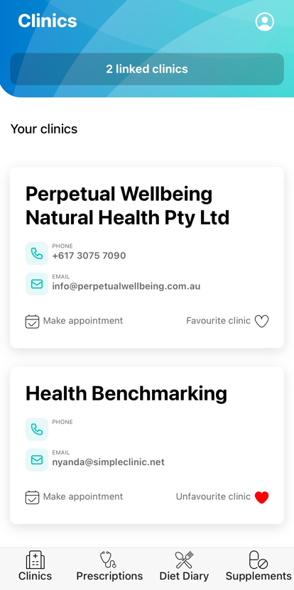 Step 3. View all linked clinics on the Clinics tab -> select a Favourite Clinic to log diet diary information with this clinic.