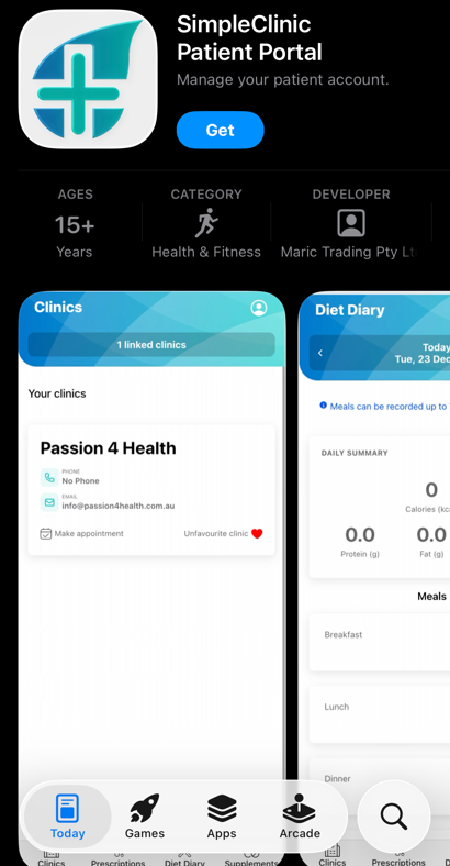- The SimpleClinic Patient Portal mobile app is currently only available on the Apple iStore and only accessible via a shareable link (to prevent unwanted users signing up).