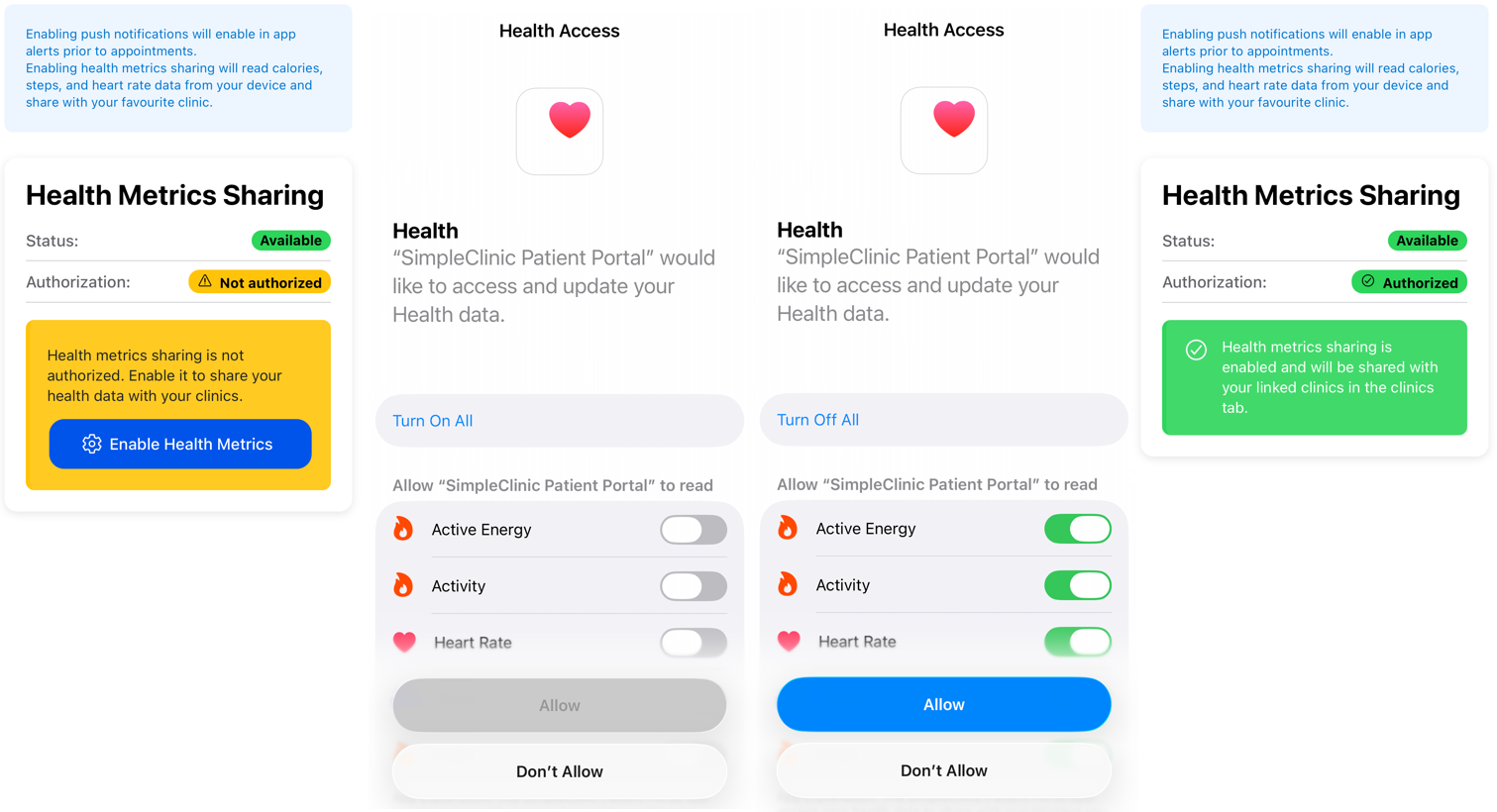Step 12. Enable Health Metrics sharing to share calories, heart rate, sleep and steps data with your favourite clinic.