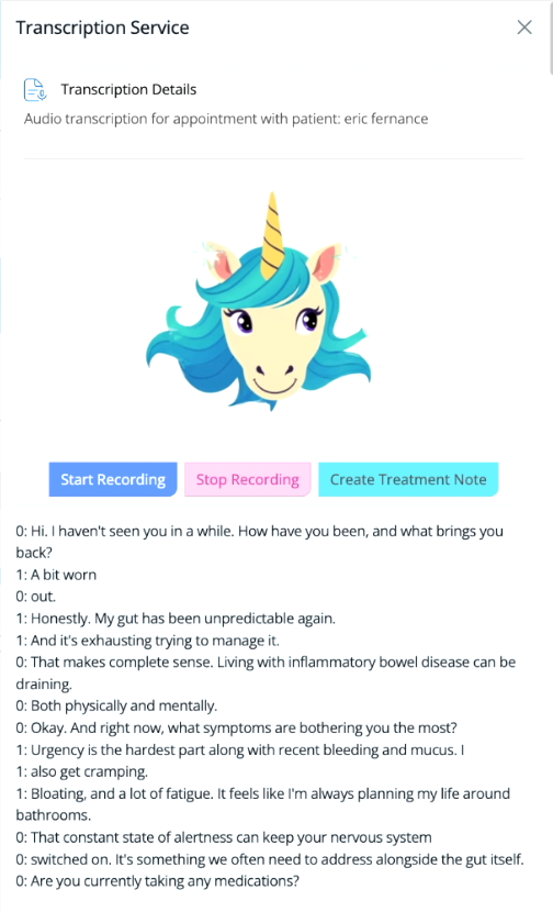 During a consultation, the system records the audio and generates a transcript. This transcript is then processed by AI and organised into the fields used in your treatment note.