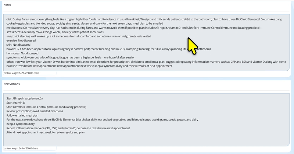 Step 3. Because the system does not know the appointment type used for the consultation, the generated content will be placed into the Notes and Next Actions fields (or as assigned above). Content will be grouped into logical sections so you can easily move it into the appropriate fields if required.