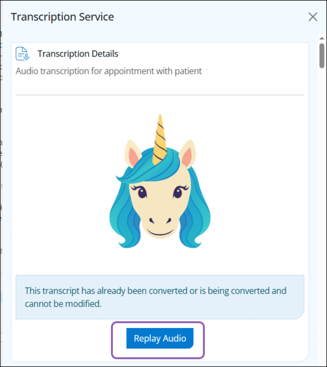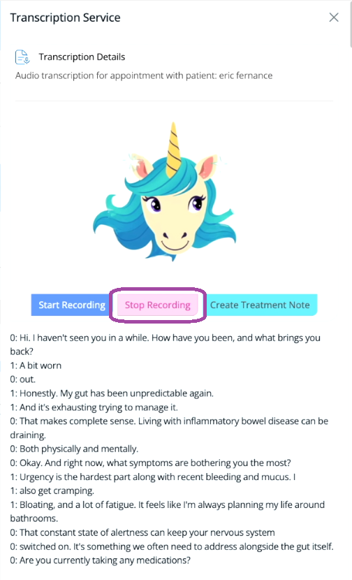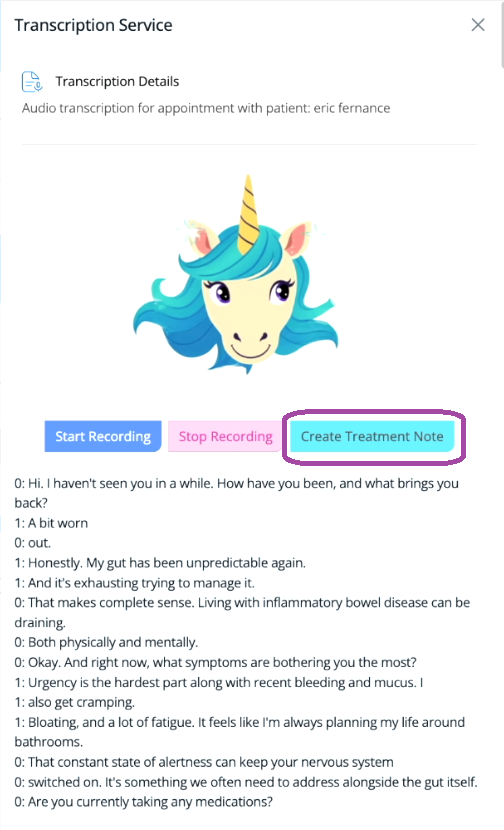 To view the full word-for-word transcription --> select 'View Transcription' from the bottom of the Treatment Note page.