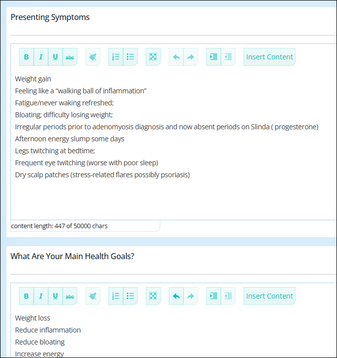 The content generated in each section depends on the custom fields configured in your appointment type, allowing information to be grouped into the relevant parts of the treatment note.